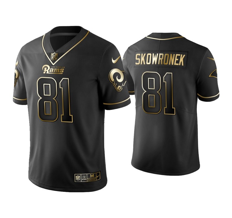 Every fan has various pieces of fan apparel that are a little different from the standard clothing that makes up most of their wardrobe or collection, and this Men Los Angeles Rams #81 Golden Edition Vapor Limited Ben Skowronek Black Jersey will definitely stand out from the others. The Gold Vapor Untouchable Limited jersey design includes a golden team graphics screen-printed on the front and on both sleeves, the golden player's name and number on the the front and back.